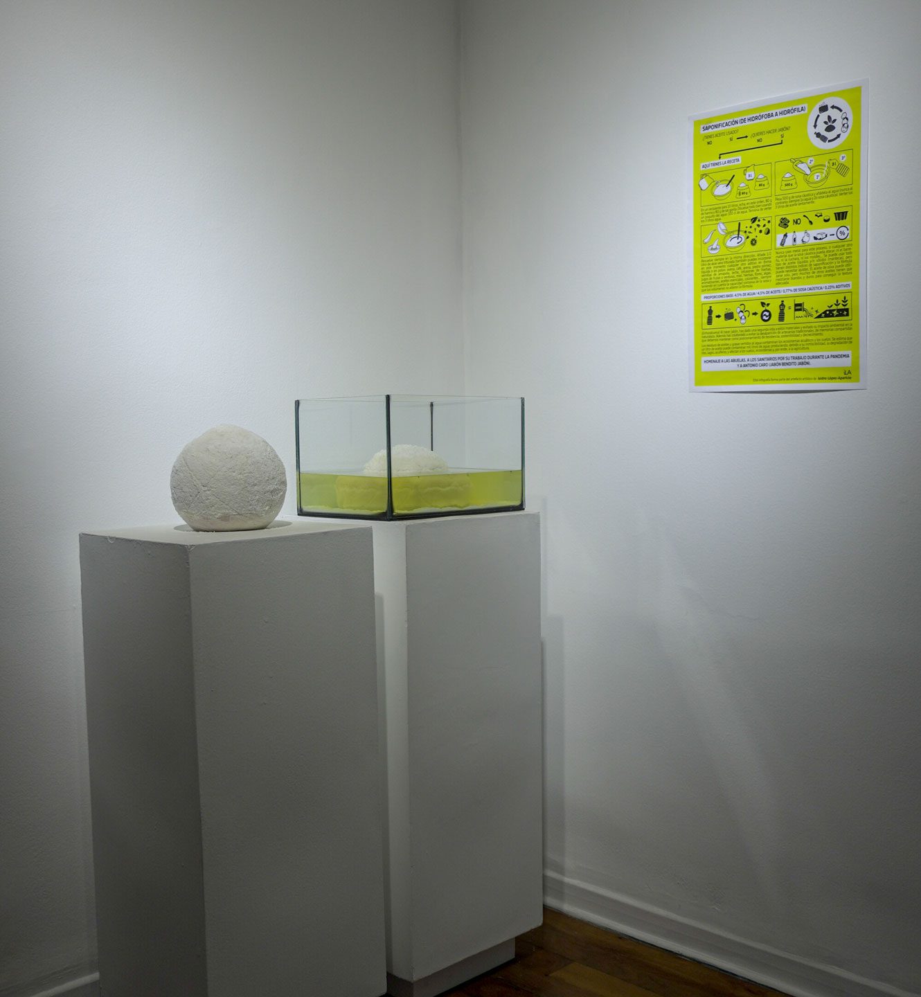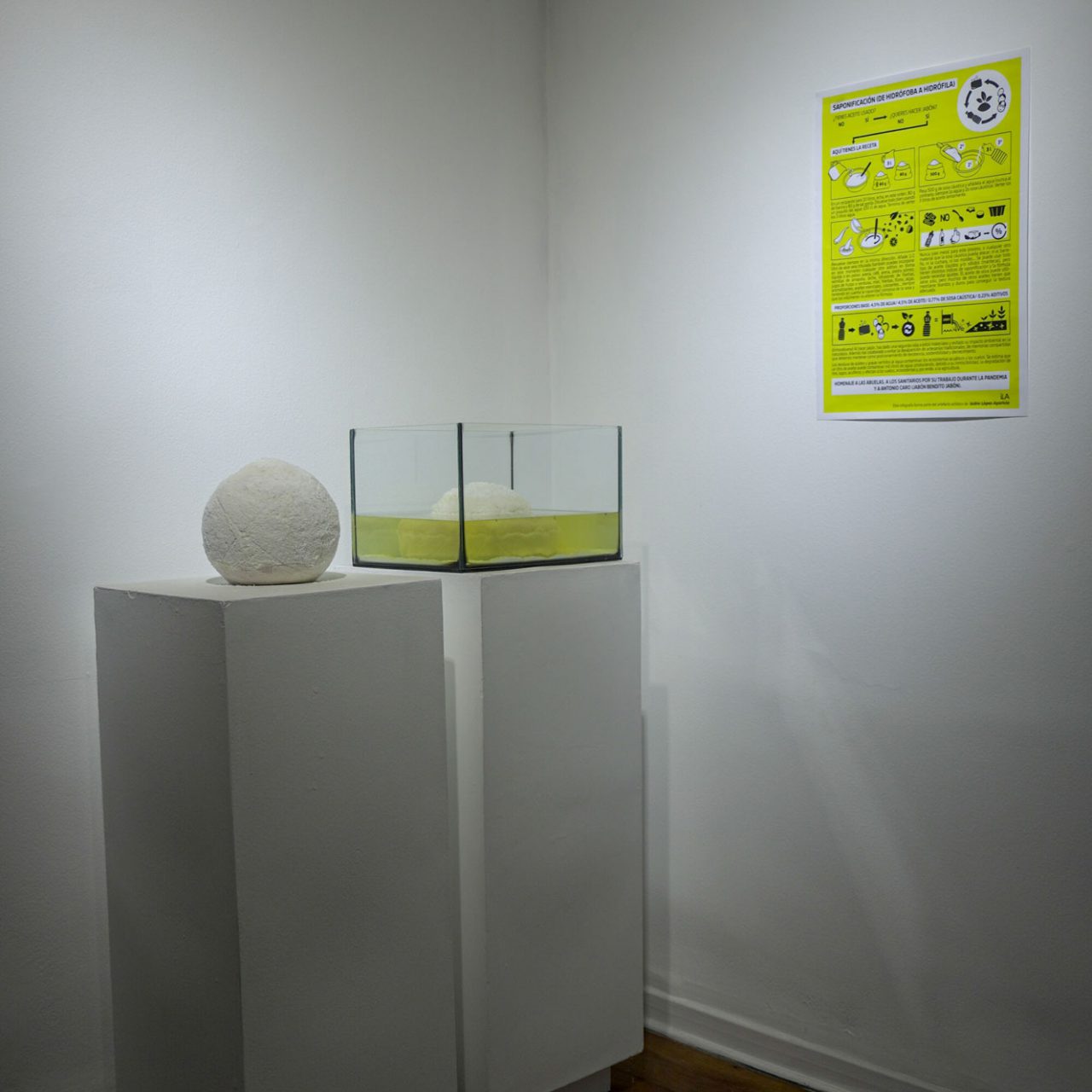 Este elemento forma parte de la memoria del artista –desde que de niño ayudara a hacerlo a su abuela–, y entra dentro de la línea de López-Aparicio de defensa de las artesanías como un posicionamiento de resistencia, sostenibilidad y decrecimiento. A partir de las instrucciones y el trabajo a distancia con el artista, desde el Centro Cultural de España en Lima se han elaborado los jabones de esta instalación, utilizando el aceite cedido por los propios vecinos y usuarios.
